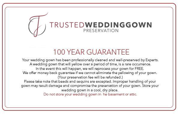 Although a lot of companies will offer you a lifetime guarantee, we’re firm believers in our work’s quality. Our 100-year anti-yellowing, anti-staining promise ensures your dress will look great for multiple generations. How much extra time is our guarantee compared to a “lifetime”? On average, roughly 50 years! Our guarantee starts from the day the dress is preserved which means your gown can be worn by your children, grandchildren and even great grandchildren—all under the same guarantee.
