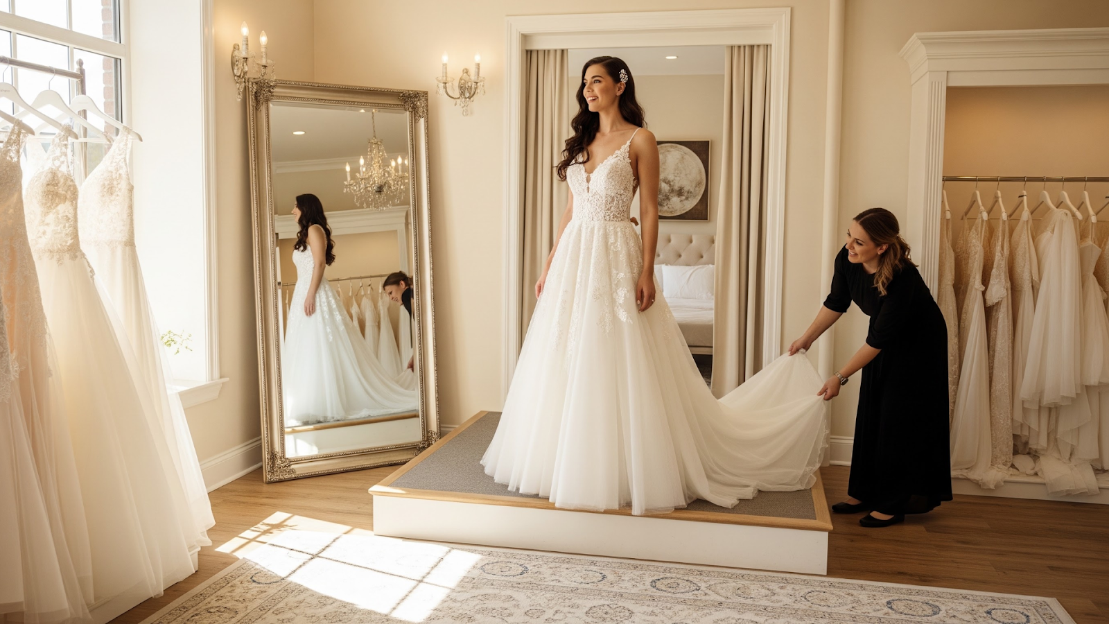 Frequent fittings mean repeated handling, pinning, and steaming. Alteration studios can expose dresses to dust and light makeup transfer.